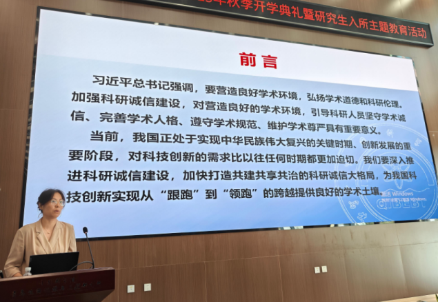 开学典礼后,为期两天的研究生入所主题教育接续开展,围绕科研能力、安全意识、职业规划、制度规范四大模块,打造内容丰富、形式务实的专题课程,为新生科研生涯“保驾护航”。监督审计室作科研诚信与学术规范教育主题报告,通过违反科研诚信的典型案例警示新生,强调实验记录的真实性、完整性与规范性,警醒大家筑牢学术诚信底线。科学传播处、综合管理处、公共实验室分别就网络安全、日常安全、实验室及化学品安全进行系统培训,强化“人人讲安全、个个会应急”的责任意识,提醒新生当好自身安全第一责任人。