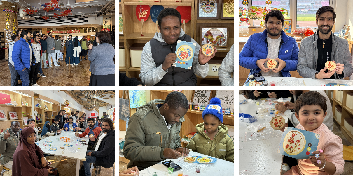 当天下午,一行人前往青岛市非物质文化遗产体验中心,开展了一场别开生面的文化实践课程。在讲解老师的引导下,留学生们依次参观了剪纸、青岛年画、紫砂壶、传统食模等非遗项目,深入了解了其历史渊源与文化内涵。在随后的动手实践环节中,留学生在工艺老师的指导下亲手制作珐琅杯垫,从构图、上色到定型完成,每一步都凝聚了专注与创意,在实践中深刻感受到中国传统手工艺的独特魅力。