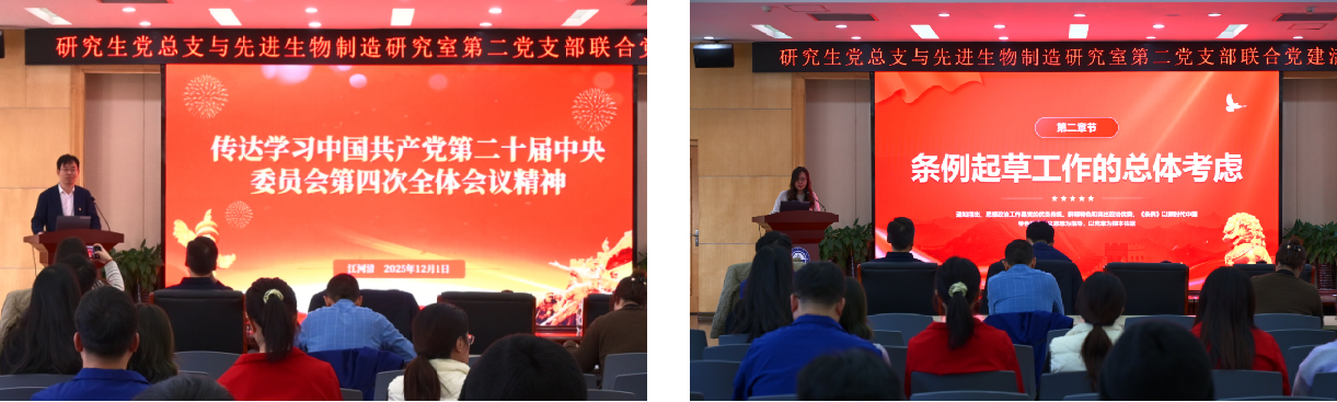 为促进理论学习与业务交流相融合、精神传承与科研实践相结合,推动党建与科研工作深度融合,2025年12月1日,研究生党总支与先进生物制造研究室第二党支部联合举办党建活动。本次活动特邀江河清副所长莅临指导,研究生党总支、先进生物制造研究室第二党支部全体党员及第四党支部支委代表共同参与。先进生物制造研究室第二党支部书记李福利主持活动。